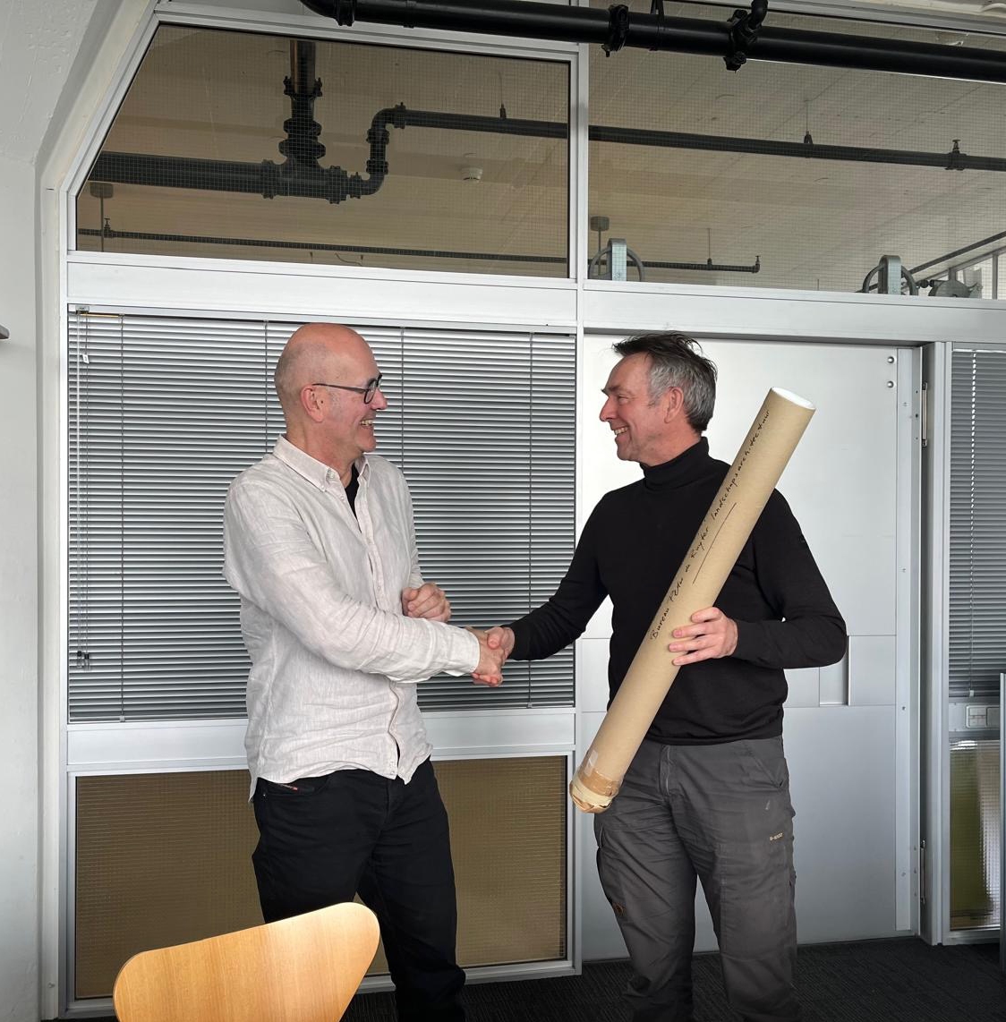 Op de foto de symbolische overhandiging van het landschapsdeel van het archief aan Sander Nelissen van WDJArchitecten in Rotterdam (foto: Rinske de Ruyter).